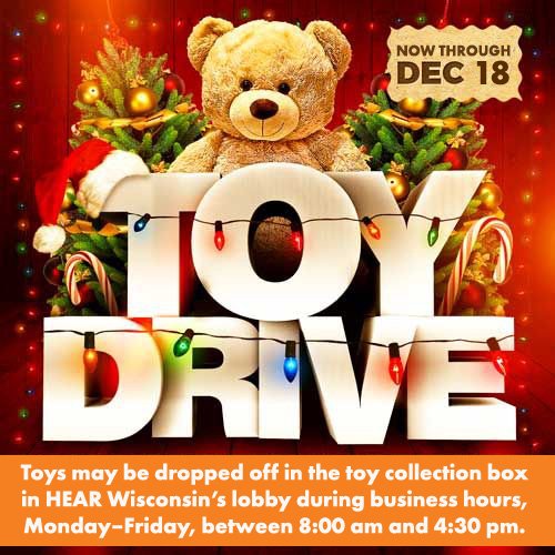 Toys may be dropped off in the toy collection box in HEAR Wisconsin’s lobby during business hours, Monday–Friday, between 8:00 AM and 4:30 PM through December 18.